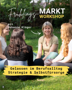 Wir freuen uns riesig, dass @johanne.klaeger mit ihrem Workshop „Gelassen im Berufsalltag Strategie & Selbstfürsorge“ auf unserem Frühlingsmarkt dabei ist.